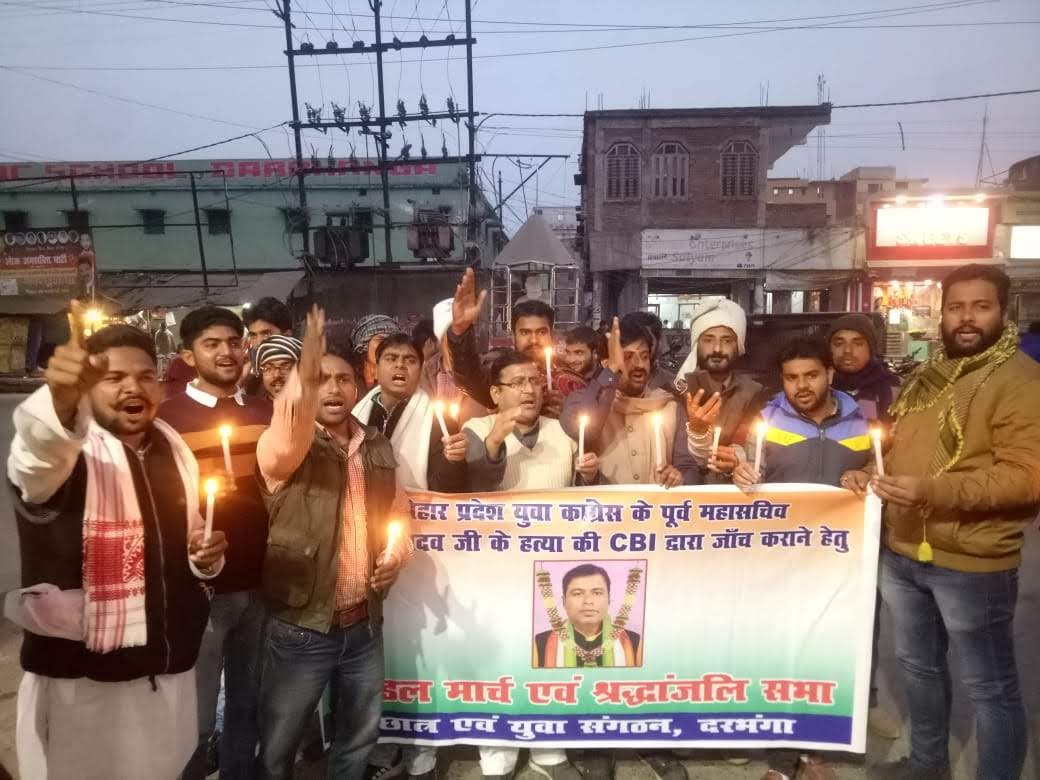 दरभंगा में 2. 1.2020 को विगत 28 दिसंबर को हाजीपुर में युवा कांग्रेस के प्रदेश महासचिव राकेश यादव की हत्या को लेकर दरभंगा में श्रद्धांजलि सभा एवं कैंडल मार्च का आयोजन युवा कांग्रेस, जन अधिकार छात्र परिषद,NSUI सहित विभिन्न छात्र एवं युवा संगठन के लोगों द्वारा संयुक्त रूप से आयोजित किया . कैंडल मार्च के बाद भोगेंद्र झा चौक पर एक सभा आयोजित की गई जहां 2 मिनट का सभी ने मौन व्रत रखकर श्रद्धांजलि अर्पित किए व.सभा को संबोधित करते हुए युवा कांग्रेस के सैयद तनवीर अनवर ने कहा की बिहार के पुलिस प्रशासन पूर्ण रूप से विफल है. जिस प्रकार राकेश यादव की हत्या अपराधियों ने दिनदहाड़े सड़क पर किया और अभी तक अपराधी को पकड़ने में पुलिस विफल रही हैं ये बिहार सरकार और बिहार की पुलिस प्रशासन की कायराना हरकतें हैं जिसको लेकर के आम जनमानस में आक्रोश है।