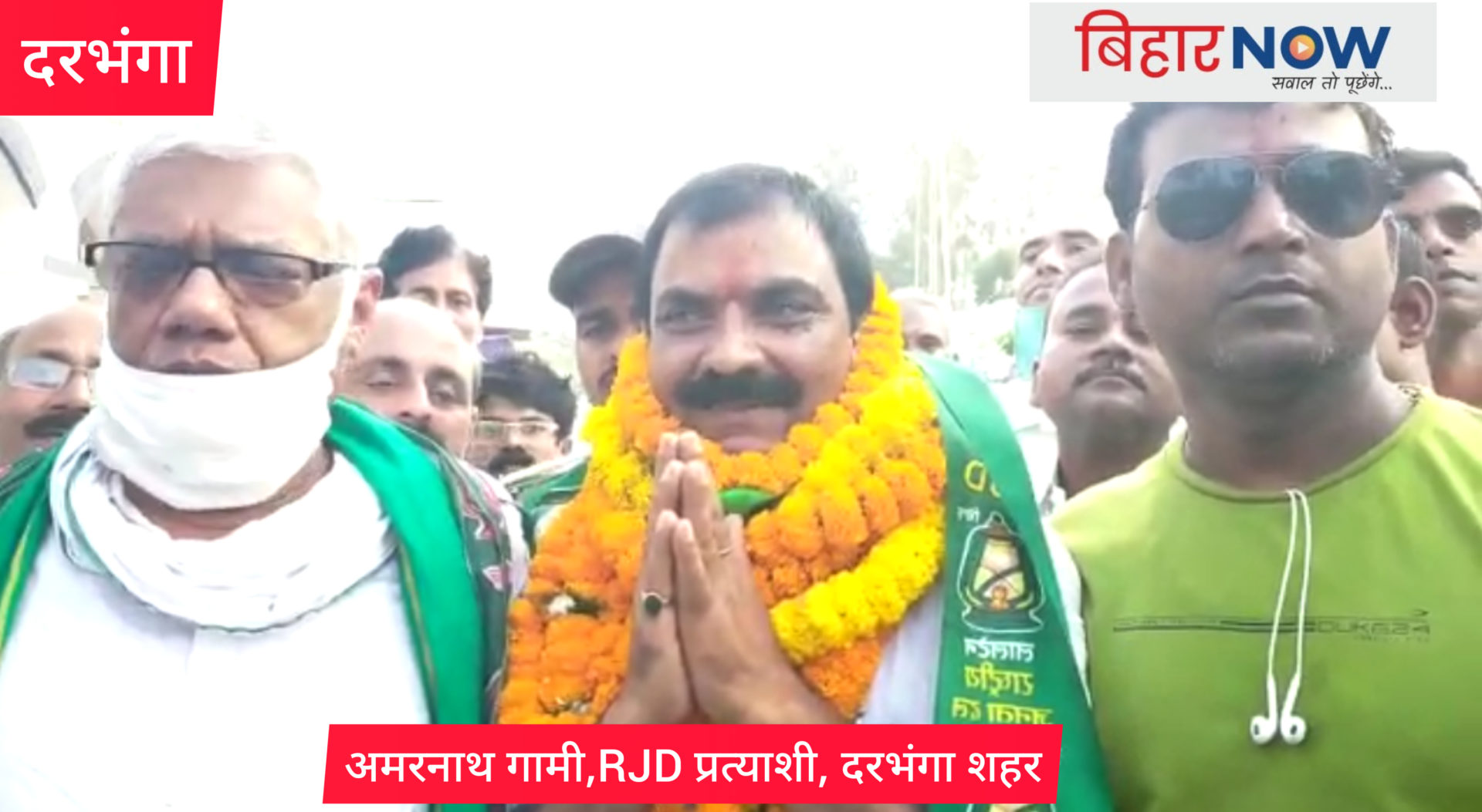 रभंगा,बिहार:आज दिनांक 19 अक्टूबर 2020 को आरजेडी के उम्मीदवार अमरनाथ गामी नामांकन करने दरभंगा समाहरणालय पहुंचे जिनमें उनका काफिला दरभंगा जिला के मारवाड़ी हाई स्कूल से मशरेफ बाजार, किलाघाट,उर्दू एवं दारु भट्टी होते हुए दरभंगा समाहरणालय पहुंचे!