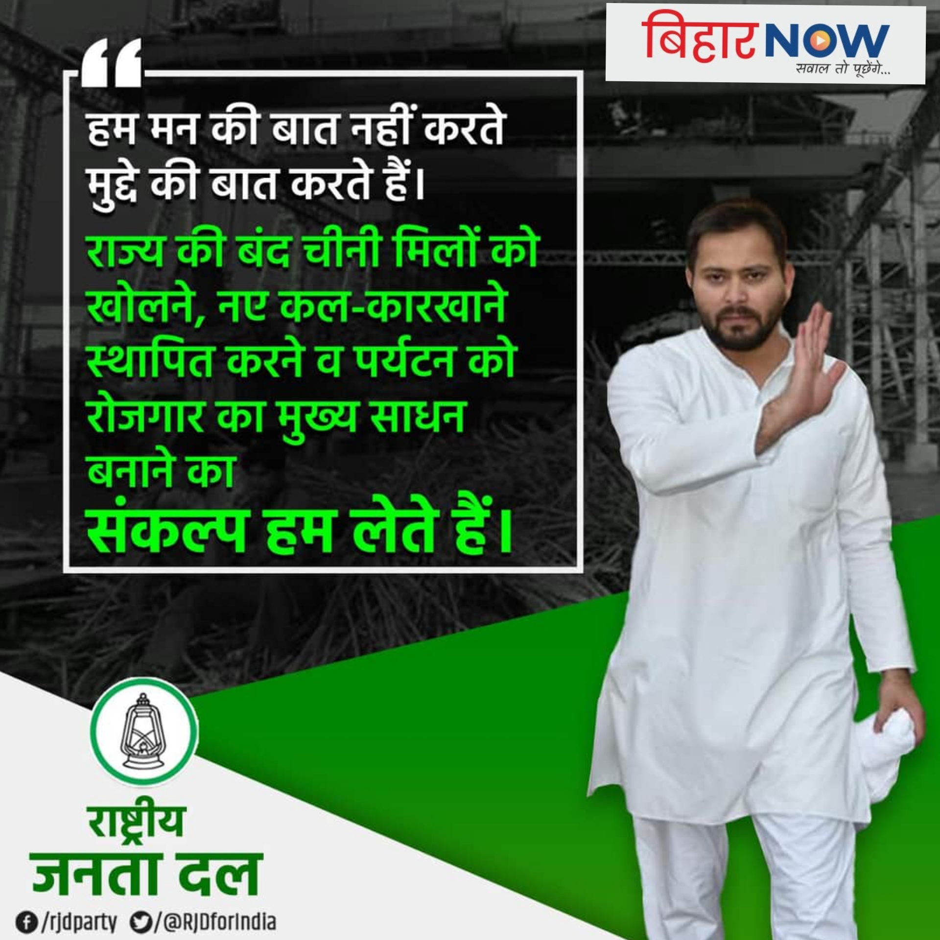 इसी के साथ तेजस्वी यादव ने जनता को अपना विज़न बताते हुए कहा कि हमने बंद चीनी मिलों, राइस मिलों, पेपर मिलों, जुट मिलों और अन्य कारख़ानों को खोलना है। नए उद्योग स्थापित करने है। बिहार में आईटी पार्क और एसईज़ेड बनाने है। इंडस्ट्री स्पेसिफ़िक क्लस्टर स्थापित करने है।